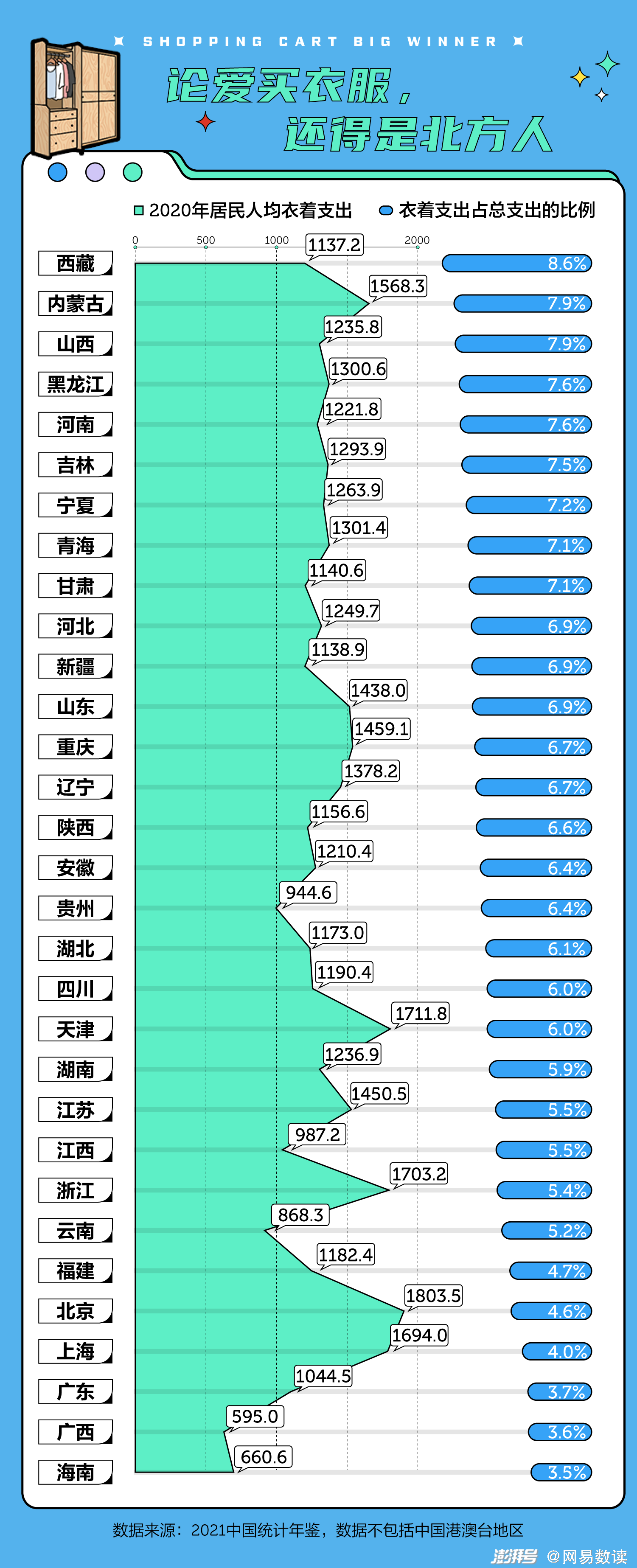 不过从支出占比来看,西藏人才是最“舍得”买衣服的。在西藏,平均每个人有 8.6% 的支出是用于购置衣物,这个比例是上海的 2 倍多。
