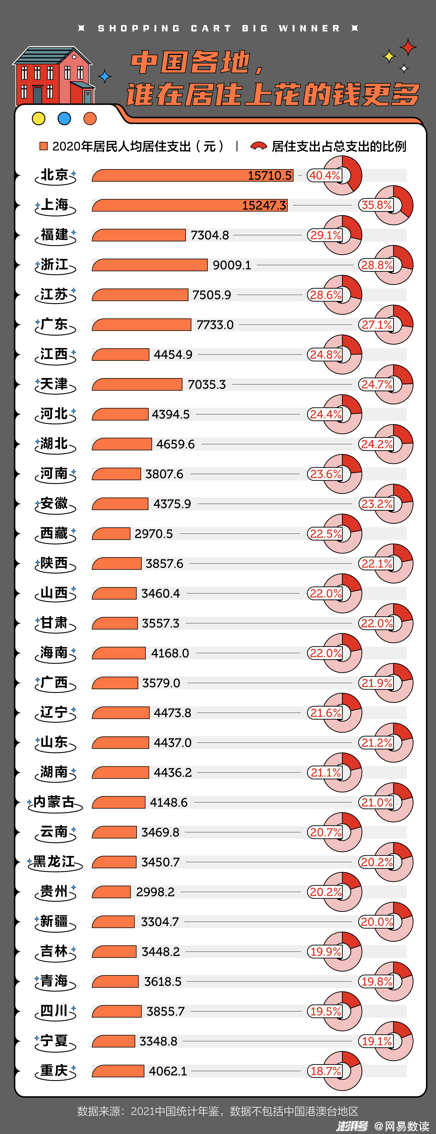 虽然在全国层面,居住支出的占比输给了食品烟酒,可一旦分省看,部分省份的居住费用比食品烟酒支出要高 [1]。