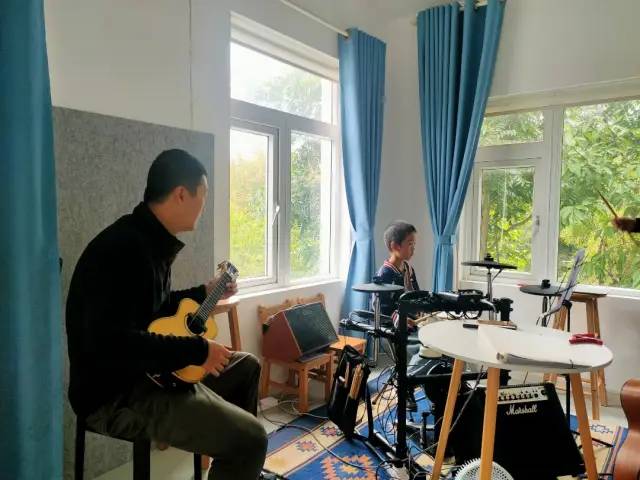 音乐上,学习了10个月共30节课的视唱练耳,现在跟爸爸一起练习尤克里里和架子鼓。