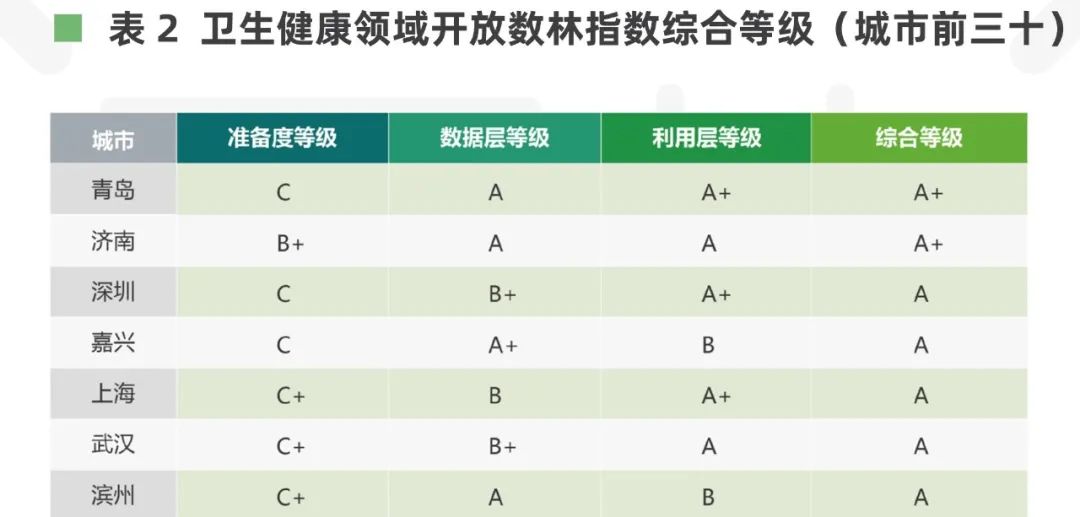 该报告基于开放数林指标体系,结合卫生健康领域特点,重点从准备度、数据层和利用层三个维度及下属多级指标对卫生健康领域开放的公共数据开展评估。其中,准备度是“数根”,是数据开放的基础;数据层是“数叶”,是数据开放的核心;利用层是“数果”,是数据开放的成效。青岛的利用层表现最优,被报告评为第一等级“A+”。