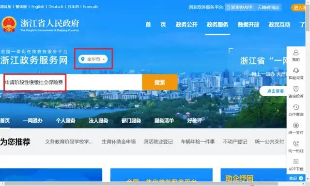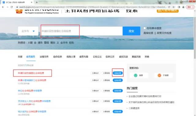 (1)登录浙江政务服务网,搜索“申请阶段性缓缴社会保险费”,选择统筹区,在事项页面选择在线办理。