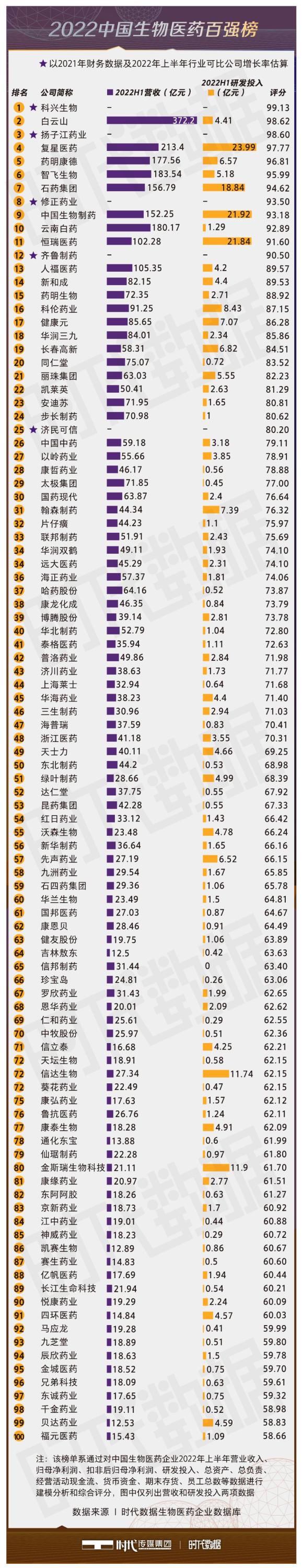 此外,智飞生物(300122.SZ)、石药集团(1093.HK)、修正药业、中国生物制药(1177.HK)、云南白药(000538.SZ)位居榜单前十;恒瑞医药(600276.SH)、齐鲁制药、人福医药(600079.SH)、新和成(002001.SZ)、药明生物(2269.HK)、科伦药业(002422.SZ)、健康元(600380.SH)、华润三九(000999.SZ)、长春高新(000661.SZ)、同仁堂(600085.SH)位居榜单前二十。