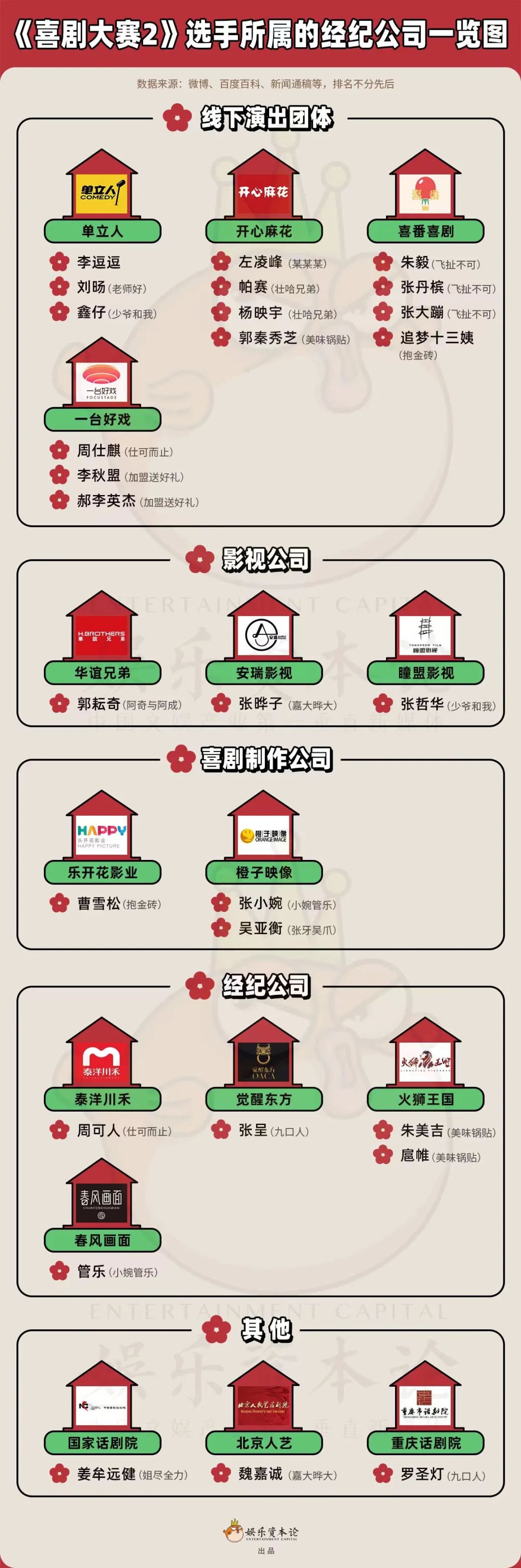 更重要的,是在于《喜剧大赛》的强人物、强养成属性,既是选手们的角逐场,更是背后公司博弈的舞台,投注的好时机。今年《二喜》选手的背后,同样站着不少公司的身影。既有单立人、开心麻花等线下喜剧厂牌,华谊、瞳盟等传统影视公司,乐开花、橙子映象等喜剧制作公司,也有觉醒时代、泰洋川禾经纪型公司,出品方米未也在暗暗发力。