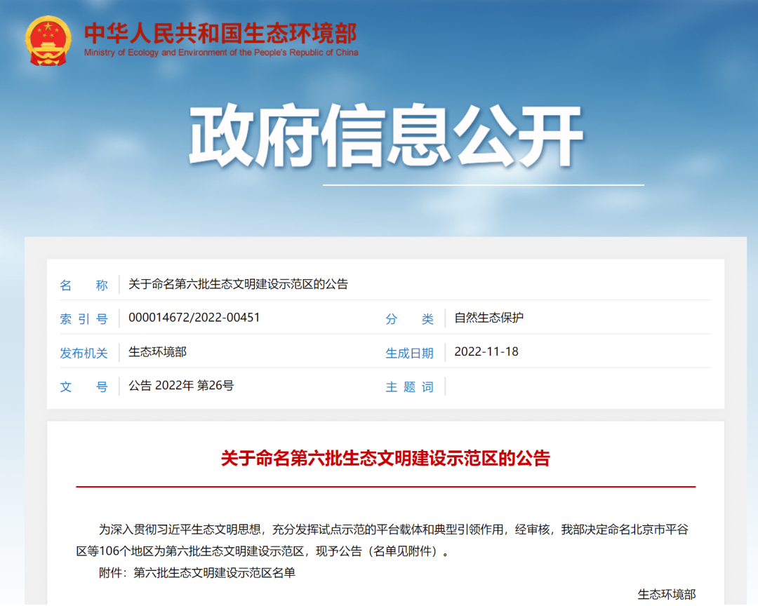 为深入贯彻习近平生态文明思想,充分发挥试点示范的平台载体和典型引领作用,经审核,我部决定命名北京市平谷区等106个地区为第六批生态文明建设示范区,现予公告(名单见附件)。