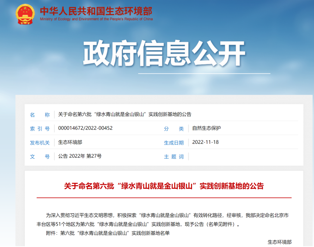 为深入贯彻习近平生态文明思想,积极探索“绿水青山就是金山银山”有效转化路径,经审核,我部决定命名北京市丰台区等51个地区为第六批“绿水青山就是金山银山”实践创新基地,现予公告(名单见附件)。