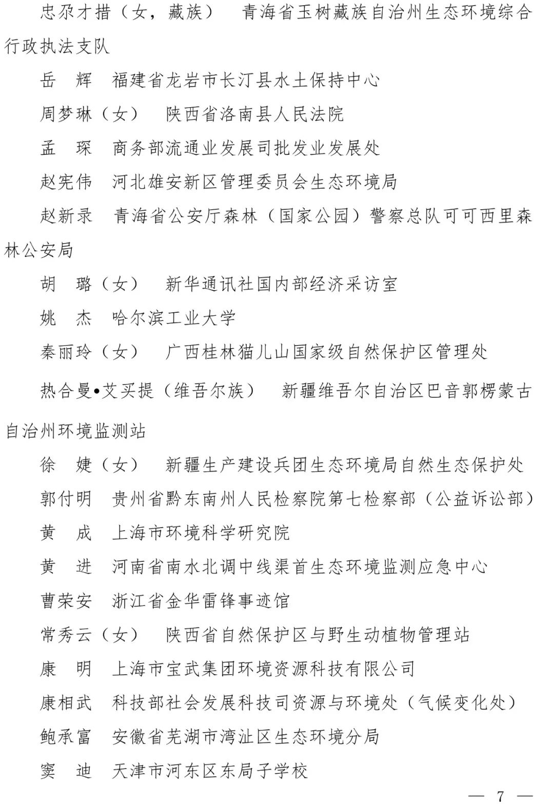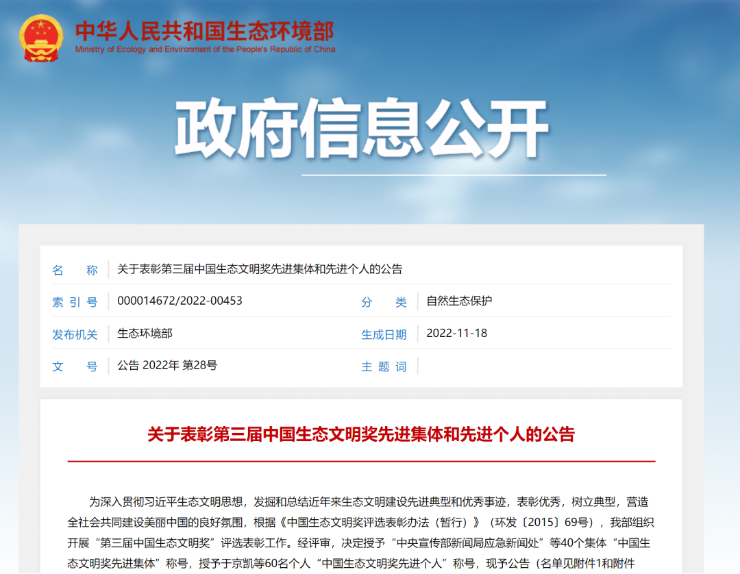 为深入贯彻习近平生态文明思想,发掘和总结近年来生态文明建设先进典型和优秀事迹,表彰优秀,树立典型,营造全社会共同建设美丽中国的良好氛围,根据《中国生态文明奖评选表彰办法(暂行)》(环发〔2015〕69号),我部组织开展“第三届中国生态文明奖”评选表彰工作。经评审,决定授予“中央宣传部新闻局应急新闻处”等40个集体“中国生态文明奖先进集体”称号,授予于京凯等60名个人“中国生态文明奖先进个人”称号,现予公告(名单见附件1和附件2)。
