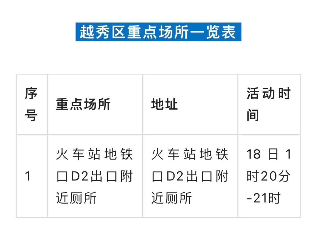 广州市越秀区11月19日凌晨发布提醒,因新冠疫情防控需要,请在11月18日18日1时20分至21时到过越秀区火车站地铁口D2出口附近厕所的人员,立即向所在社区联系报备,严格落实“3天3检”,并配合做好疫情防控各项措施。