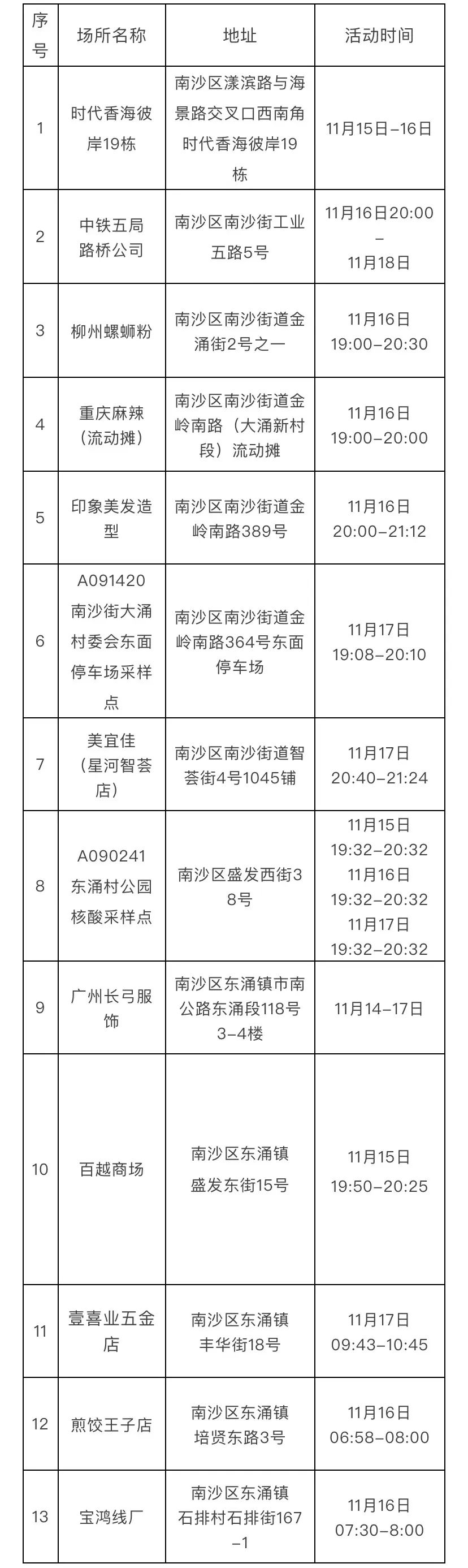 因新冠疫情防控需要,请在相关时段到过南沙区下述重点场所的人员,立即向所在社区(村)联系报备,严格落实“3天3检”,同时配合社区(村)和疾控部门要求做好健康管理。若不如实申报,不落实防控措施,造成严重后果的,将承担相应法律责任。