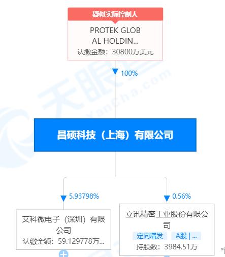 为何立讯精密会接手昌硕的上海的厂房?《科创板日报》记者从天眼查APP查询到的工商信息显示,双方并非“陌路人”。实际上,双方早有合作,昌硕科技(上海)有限公司最新持有持有立讯精密0.56%股份,持股数量为3984.51万股。