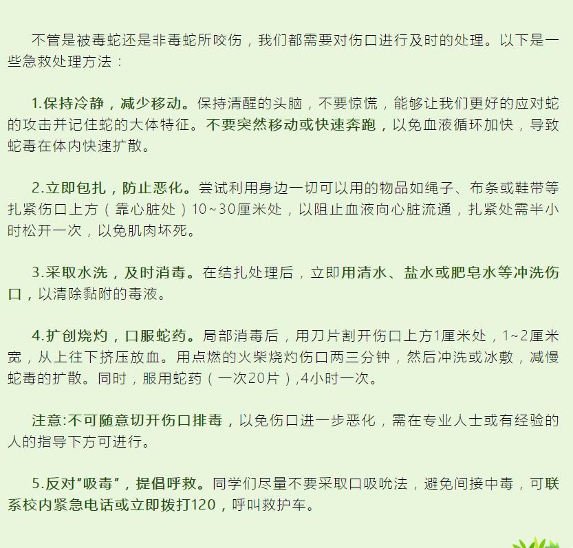 第一,被毒蛇咬伤的伤口通常会有两个明显的毒牙痕,有时也可见到1~3个毒牙痕。在被毒蛇咬之后,会出现视物模糊、眼睑下垂、嗜睡、四肢无力、恶心、呕吐等症状。