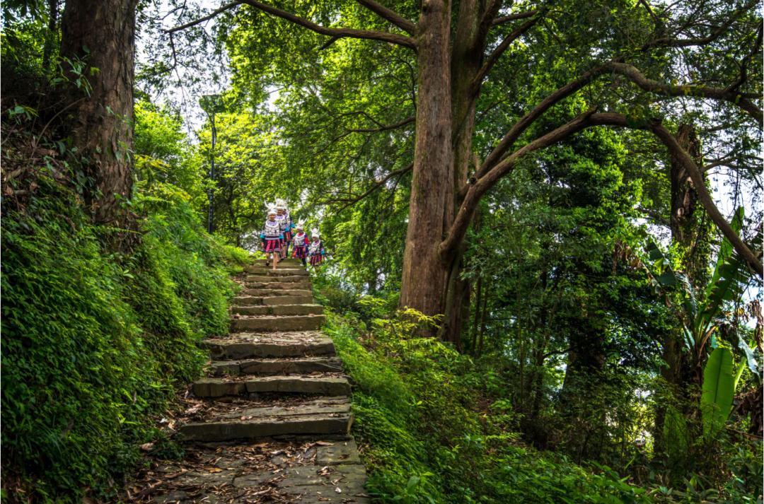青石步道随山而上,古木葱茏、民舍隐藏其间。整个村寨300多幢清一色的木质吊脚楼掩映在古树翠竹中。