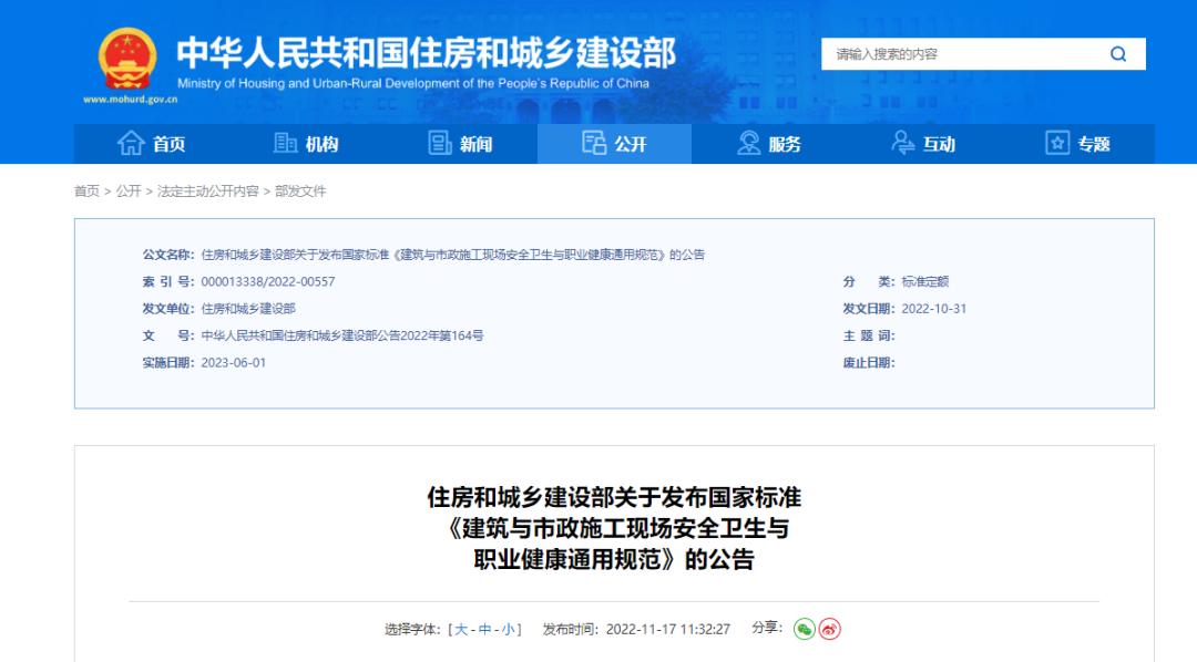 11月17日,住建部发布国家标准《建筑与市政施工现场安全卫生与职业健康通用规范》,自2023年6月1日起实施,同时废止118项工程建设标准相关强制性条文。详见↓