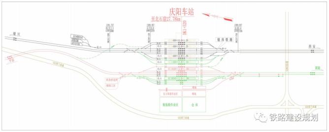 银西铁路在庆阳市西侧司官寨附近设庆阳站,设到发线7条(正线2条),预留到发线2条,设450×12×1.25m基本站台1座,450×12×1.25m岛式站台2座,预留1座,跨线设施2处,行包地道1处,站房面积15000m2,站同右设动车存车场、救援设施及综合维修车间。车站西侧及银川端预留平庆铁路引入条件。