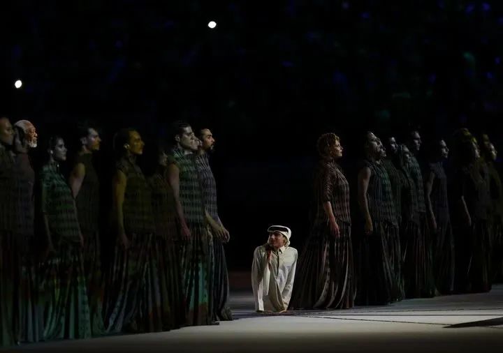 11月20日,2022年国际足联世界杯大使加尼姆·阿尔·穆夫塔(中)在开幕式上。新华社记者 李明 摄