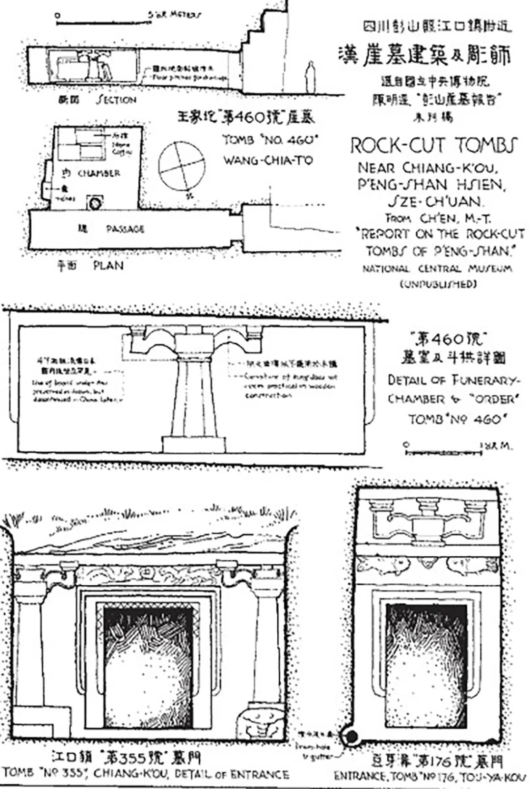 营造学社在川康古迹调查沿途中所见的汉代建筑遗存,为梁思成着手写《中国建筑史》的汉代部分积累了资料。梁思成《中国建筑史》两汉部分将汉代建筑遗存分为实物和间接资料,崖墓、汉阙、石室、墓为实物,明器、画像石为间接资料。梁并没有以崖墓中的仿木构信息推测汉代木构建筑史发展状况,而是将崖墓视为建筑史学上具有重要意义的最早遗例类型,对其进行空间特征阐述,并客观记录仿木构信息出现的空间位置及具体的仿木特征。此外梁思成还留意到崖墓作为墓葬建筑在空间序列表达上的特殊性,即作为在壁体内开凿的整体空间,崖墓如何把其他墓室的墓前空间序列表达(如阙、石兽)缩放到墓室内去呈现。《中国建筑史》中关于崖墓的插图全部选自当时未刊发的国立中央博物院彭山崖墓测绘图(陈明达绘制)(图14)。