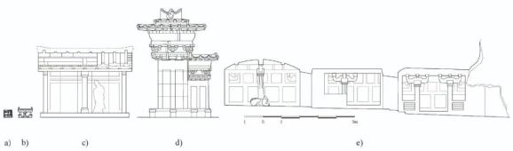 a)东汉庭院画像砖;b)乐山大湾嘴陶屋;c)朱鲔墓石室立面图;d)雅安高颐墓石阙立面图;e)郪江崖墓金IM4剖面图