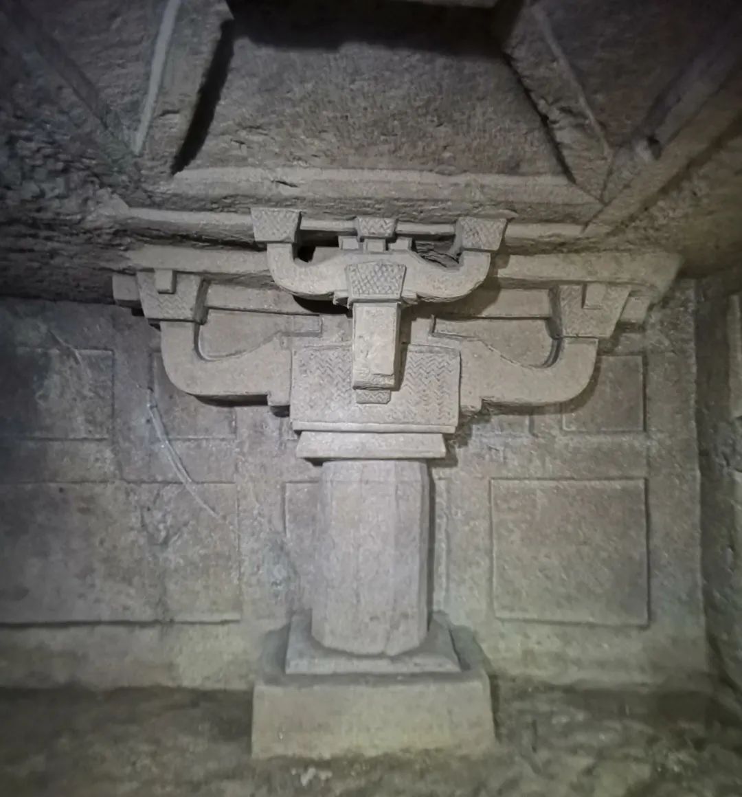 与其他墓葬空间的区别在于,崖墓不仅仅用于存放棺椁、安葬遗体,同时也设计再现了约2000年前的汉代日常室内生活环境。这为从室内视角研究木构建筑的发展提供了可能。早在营造学社调查彭山崖墓时,即发现崖墓中雕刻的斗栱在栱之中央栌斗正面刻一枋头,与四川诸汉阙一致,但崖墓的背面所雕华栱一跳,则未见于他处。崖墓反映了部分木构构件在内部空间的三维延伸,使得更为复杂的汉代木构技术问题研究可以继续深入。以往汉代建筑史研究主要依赖画像石、画像砖、明器、汉阙上的建筑外部空间信息,崖墓的内部空间虽然很丰富,但是仍然只停留在单向视觉形象(如斗栱、柱子的形态)的研究层面上,没有实现内部空间和外部空间的互证研究。例如斗栱的发展演变一直被放置在外部檐口讨论,因为大多数史料只展示了斗栱与檐口的空间关系。斗栱在室内空间中是以怎样的动态向前发展的?室内空间对斗栱技术的需求有没有可能引起斗栱的设计突变?这些问题都可能在具有丰富室内空间表达的崖墓遗存中寻得答案。