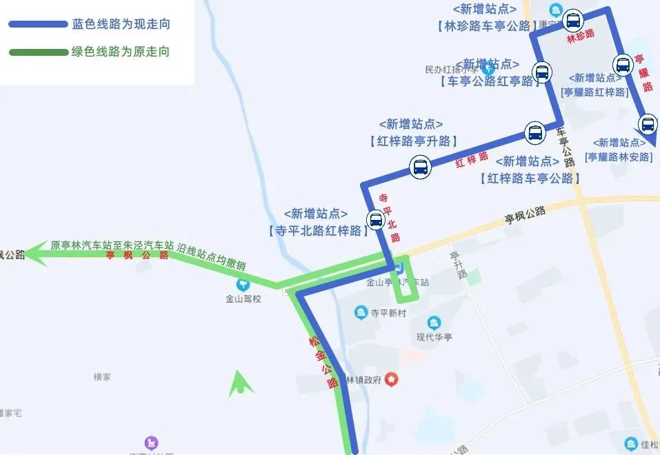 延伸路段新增站点:寺平北路红梓路、红梓路亭升路、红梓路车亭公路、车亭公路红亭路、林珍路车亭公路、亭耀路红梓路、亭耀路林安路。