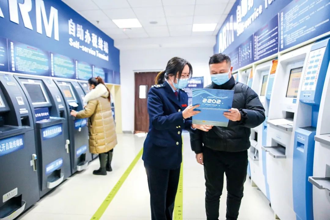 >>2022年1月11日,江苏省如皋市税务局办税服务大厅,税务宣传干部正在为纳税缴费人送上2022年办税日历并提示讲解了办税重要节点。 视觉中国供图