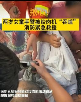2021年7月11日,河南周口一2岁女童手臂被卡在绞肉机中,手臂流血不止。消防员对绞肉机进行切割,成功破拆后,医护人员将绞肉机小心翼翼拿掉,随后立即对伤口进行简易处理,将孩子送往医救治。