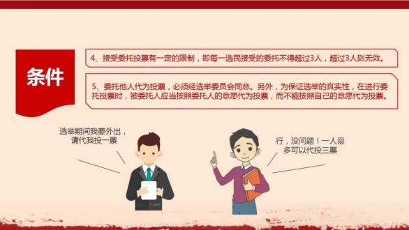选民如果在选举期间外出,经选举委员会同意,可以书面委托有选举权的亲属或者其他选民代为投票。每一选民接受委托不得超过3人,并应当按照委托人意愿代为投票。