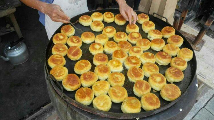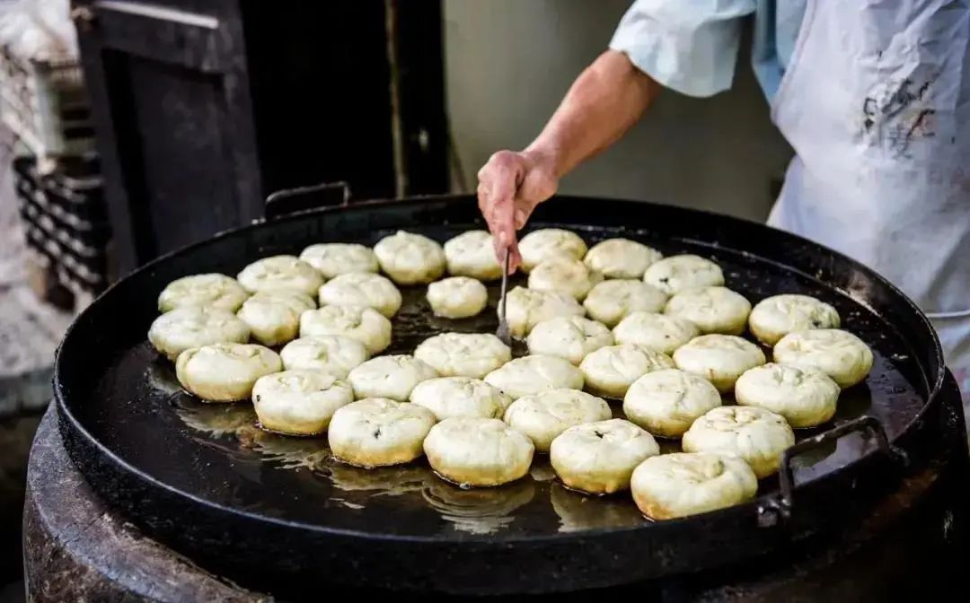 岩脚肉饼是用岩脚优质小麦磨制的面粉制作面皮, 馅料由猪肉粒、花椒粉、芝麻香油等多种调料混合。肉饼放在平底锅中,不停挪移,煎至两面金黄。肉饼外皮酥脆,一口下去,肉香满溢。岩脚醋