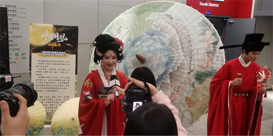 除了舞台上的展示表演,一把伞面直径2米6的特大型西湖绸伞作品《锦绣山河》也亮相活动空间。“撑开一把伞,收拢一节竹”,构思精巧、制作精良的西湖绸伞吸引了不少逛展的年轻人驻足,定睛欣赏,拍照打卡。