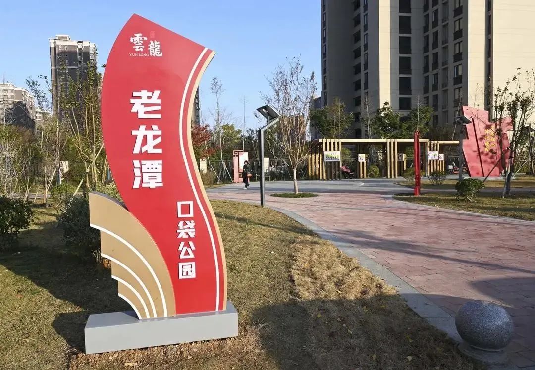 老龙潭口袋公园一期原本是一块荒地。经过改造,共栽植女贞、银杏等乔灌木300余株、模纹地被7000余平方米,铺设广场园路2063平方米,安装雕塑3处。