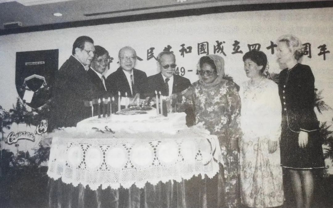 中华人民共和国成立47周年国庆时,笔者夫妇与马来西亚沙捞越州元首等贵宾共切蛋糕。