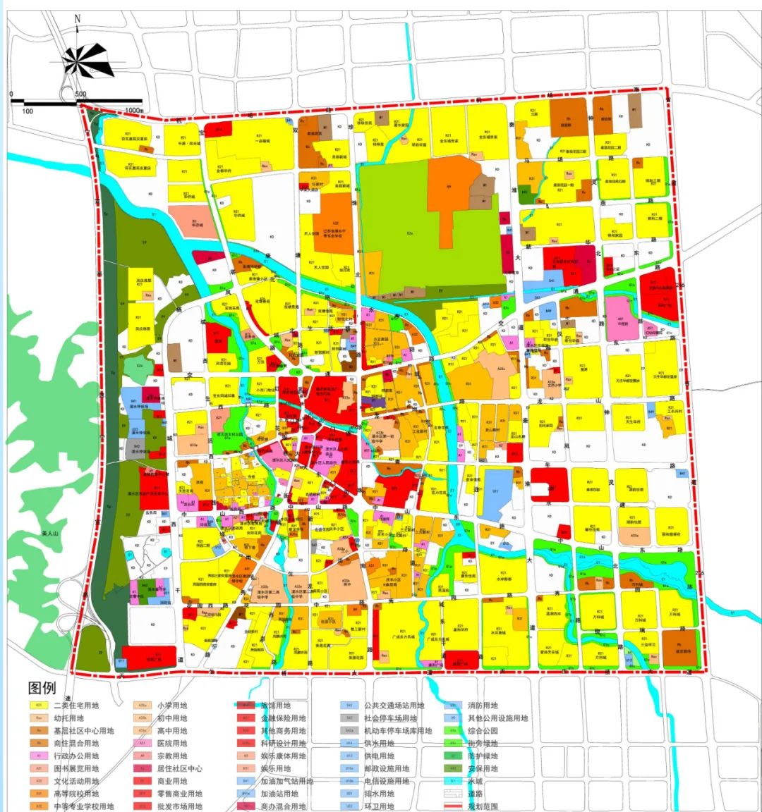 规划商业及公共服务设施用地主要由行政办公用地、文化设施、教育设施、居住社区中心用地、商业用地、科研设计用地、商办混合用地及商住混合用地构成。其中教育设施用地包括2所高中,5所初中与9所小学。