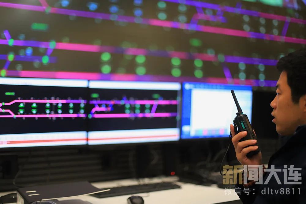12月1日9:30,在位于大连地铁5号线控制中心4楼调度大厅。几名工作人员正在操作台前紧张忙碌着,大屏幕上显示5号线的行车运行图。