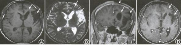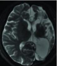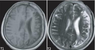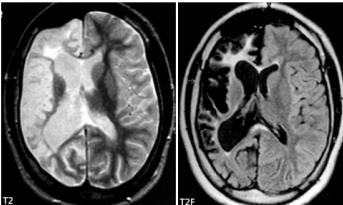 颅脑MRI表现:一侧大脑半球萎缩性改变(脑室扩大、外侧裂和脑沟增宽、脑回变小),伴有相应部位的灰质或白质萎缩和T2WI、FLAIR高信号,深部灰质核团(尾状核和壳核)也可受累,无颅骨代偿性改变。少数早期患者可表现为暂时性局部皮质肿胀及T2WI、FLAIR高信号。