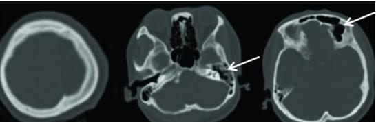 影像表现为一侧大脑萎缩,同侧侧脑室扩张、颅骨增厚、鼻窦及乳突窦增大、岩骨嵴和蝶骨大翼抬升。