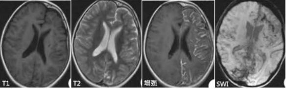 影像表现为皮质不同程度的钙化、脑萎缩、脑回样脑膜强化及深静脉增多、扩张。