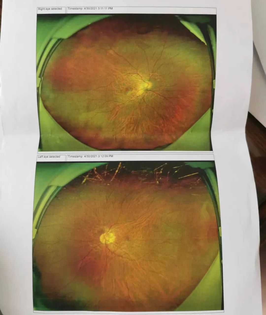 最开始,考虑到路程,我挂了附近一家刚刚晋升三甲的综合医院眼科副主任医生的号。在听完我的叙述和担忧后,医生给我开出一系列眼底检查,其中一张超声报告上写着:玻璃体内可见少量点状回声,伴连续细弱带状回声,后运动明显,双眼玻璃体混浊伴后脱离可能。