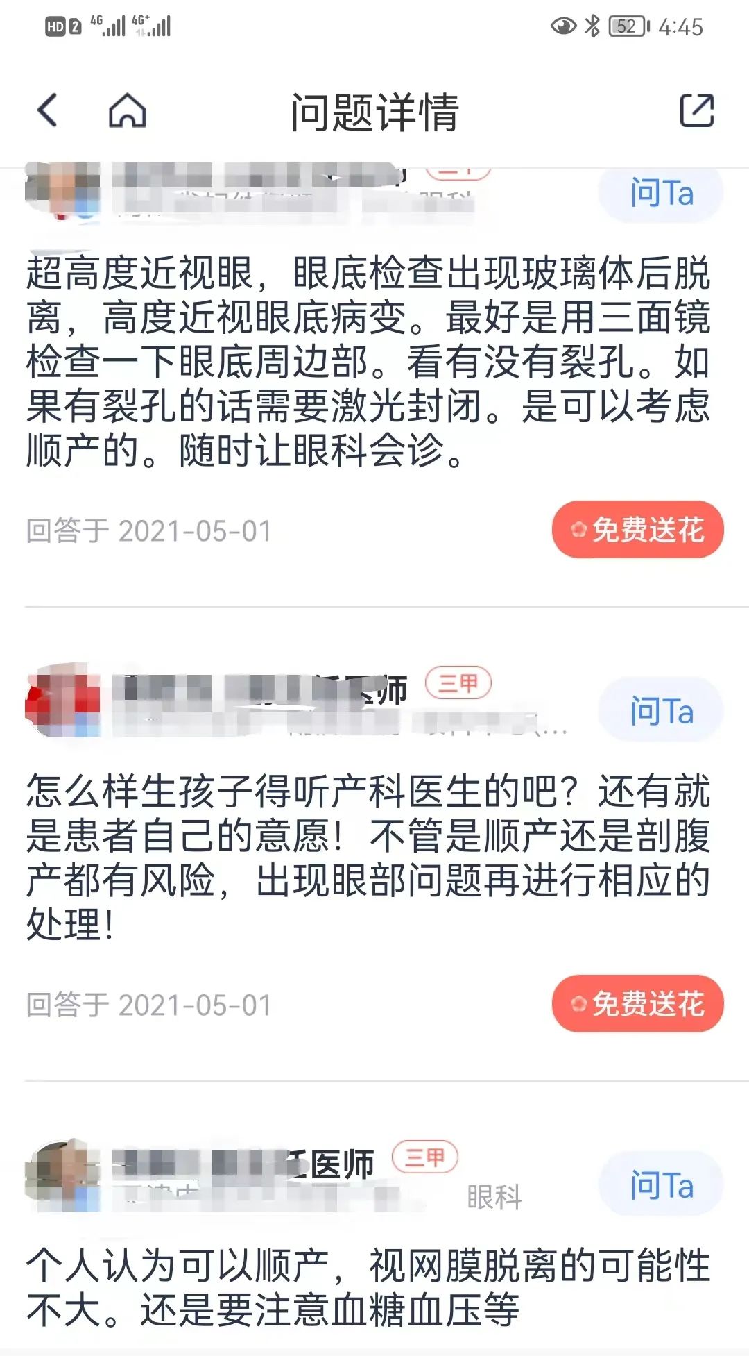 在描述了“超高度近视是否可以顺产”的疑惑,并附上了自己之前的检查单后,不到1个小时,我的手机就嘟嘟响个不停,不少主任医师都在线上回复了自己的意见。