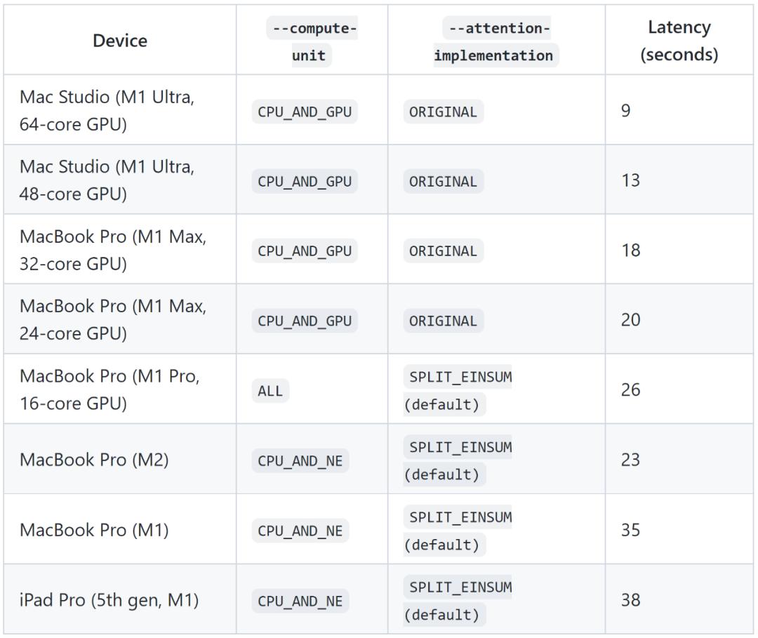 标准 CompVis/stable-diffusion-v1-4 基准。该基准测试由苹果公司在 2022 年 11 月使用 iOS 16.2、iPadOS 16.2 和 macOS 13.1 的公开测试版进行。