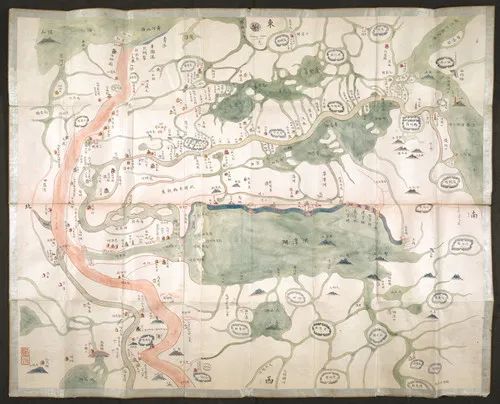 明代治河名臣潘季驯的《河防一览图》曾将黄运两河并置一图之中,描绘清康熙朝河道总督董安国治河时期情景、现分别藏于法国国家图书馆和韩国奎章阁的《黄运两河全图》亦将黄运两河置于同一画面中。此种绘制手法在明清时期均不多见,也有失真、变形之嫌,但其用意或不在于求真求实,而在于求(大)势利权(衡),即以二者来勾勒山川地理、政区之大势,权衡社稷江山东西南北之盈缺利弊,象征意义大于实际意义。