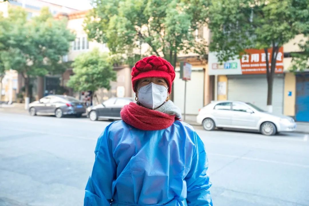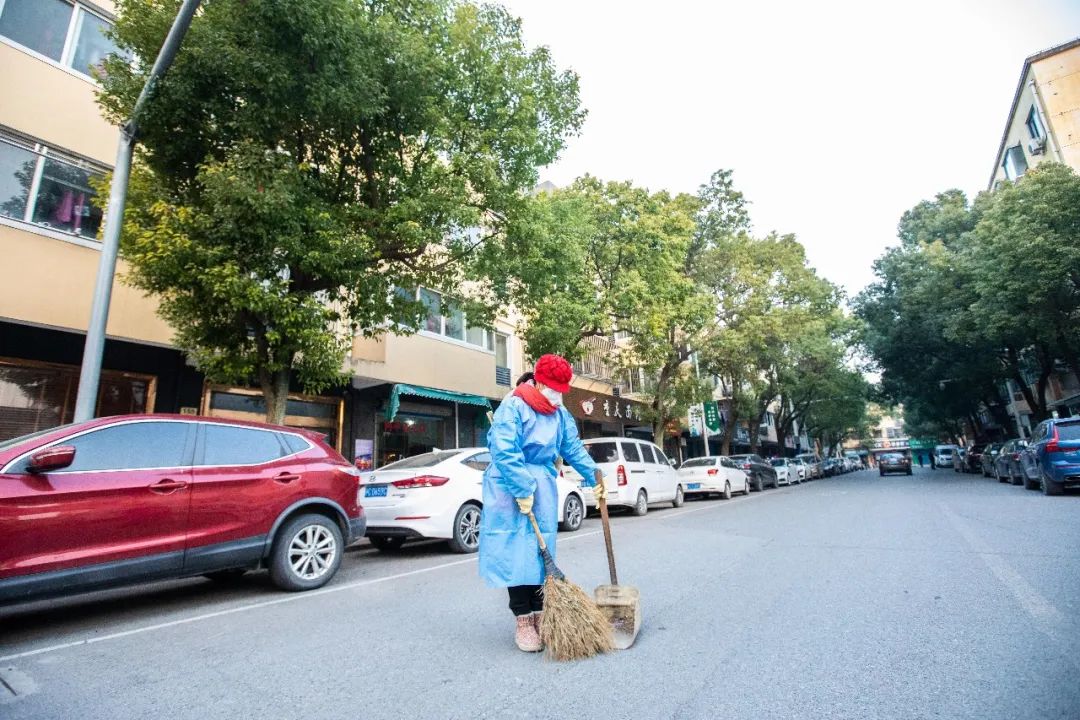 上午6:30,在柘林新寺居民区街面上,56岁的陈粉华正在进行当天的清扫工作。作为一名工龄满3年的环卫工人,新寺居民区及周边范围的保洁工作都由她和同伴们负责,而随着阳性病例的增加,一部分环卫工人因病修养在家,多出的工作量就要添加到他们的身上。