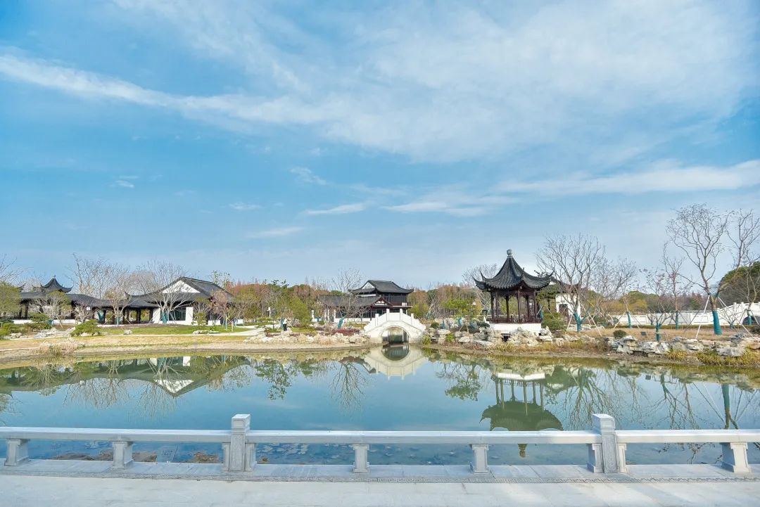 蓝天白云,山光树影,亭台水榭环绕着湖畔,彰显着江南园林的精致古朴,诗意盎然,意趣无穷。