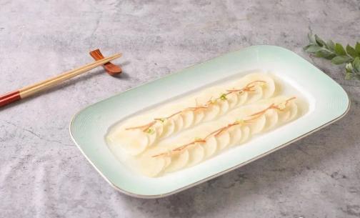 “美人照镜”是洪拳的一个招式,出招时掌心向内,五指朝天,姿势优美,有如美人照镜。而赤坭镇门口坑粉葛远近驰名,滋阴养颜。用门口坑粉葛制作的这道菜净白无瑕,形若照镜,故取名“美人照镜”。