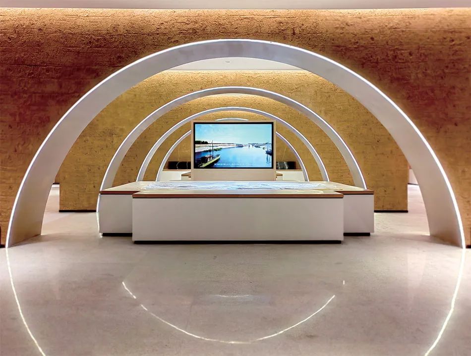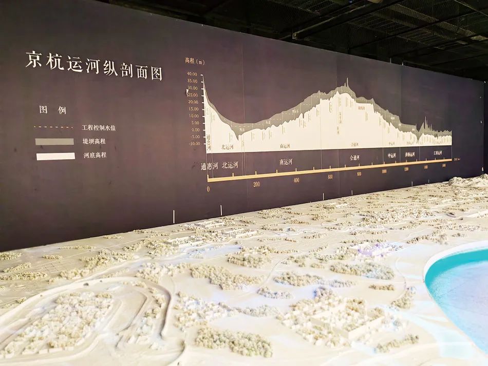 水工科技展厅内,一幅长十余米、高约两米的“京杭运河纵剖面图”同样引人瞩目。图上绘制的是京杭运河从南至北,江南运河、淮扬运河直至通惠河各河段的高程,最高处位于南旺镇,高程约40米;最低处在淮扬运河段,低于水平面约十米。剖面图前面的京杭运河流经区域真实场景模拟,同样运用了富含高科技元素和时尚色彩的光影技术。随着背景音乐的渲染和创新性电子沙盘技术的加持,大运河如一幅流动的画卷徐徐展开,运河两岸的万千繁华如真似幻,令人心旌摇曳。