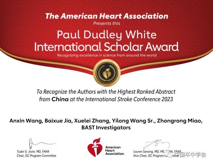 卒中领域的全球盛会之一——国际卒中大会(ISC2023)于2月8日在美国达拉斯拉开序幕,目前正在如火如荼的进行中。目前已公布了本年度Paul Dudley White国际学者奖获奖名单。该奖旨在表彰每次 AHA 科学会议的每个参与国中排名最高的科学摘要作者团队,其科学价值被世界公认。在逐鹿群雄的科研竞技场上,我国摘得桂冠的是首都医科大学附属北京天坛医院缪中荣教授带领的BAST研究团队。