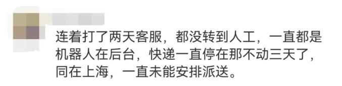 广州的王女士表示,自己网购的商品2月1日发货由中通快递揽收,但直至2月8日,物流信息一直停滞无更新。其间询问客服,也只得到机器人回复“运力紧张,包裹可能延迟送达。”