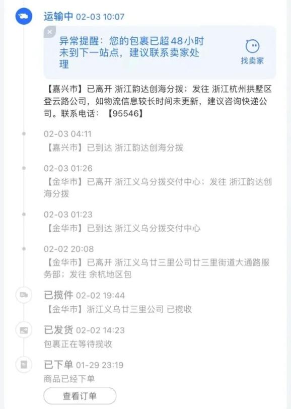 杭州庄女士于2月2日网购了金华一卖家的商品,查询物流信息显示,当天包裹就离开金华发往义乌分拨交付中心,2月3日到达嘉兴创海分拨,但之后迟迟不动,系统提示“包裹已超过48小时未到下一站点,建议联系卖家处理”。几天后,物流状态显示,庄女士的包裹距收货地131公里,预计将在2月8日送到。“省内快递竟要走一个星期!”庄女士吐槽。