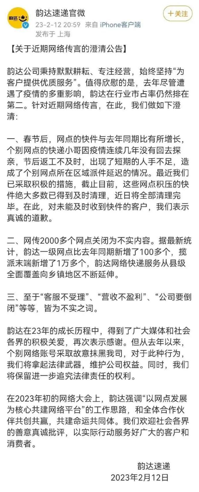 2月12日,韵达官方发布《关于近期网络传言的澄清公告》。公告称,春节后,网点的快件与去年同期比有所增长,短期的人手不足,造成了个别网点所在区域派件延迟的情况,目前网点积压的快件绝大多数已得到及时清理,近日将全部清理完毕。另外,公告称“网传2000多个网点关闭”“公司要倒闭”等为不实传言。