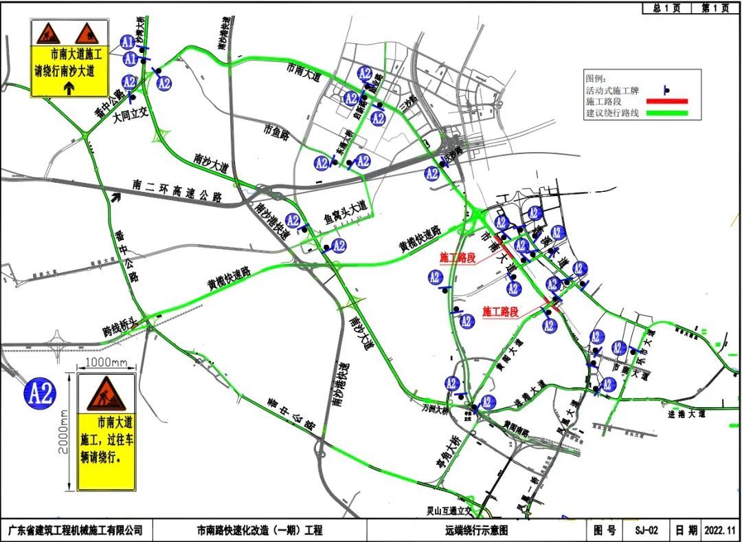 市南大道K16+160~K17+220(黄阁立交至鸡谷山路路段)东半幅整体道路及西半幅人行道、非机动车道将采取临时封闭措施,过往群众可借道利用西半幅道路双向通车;