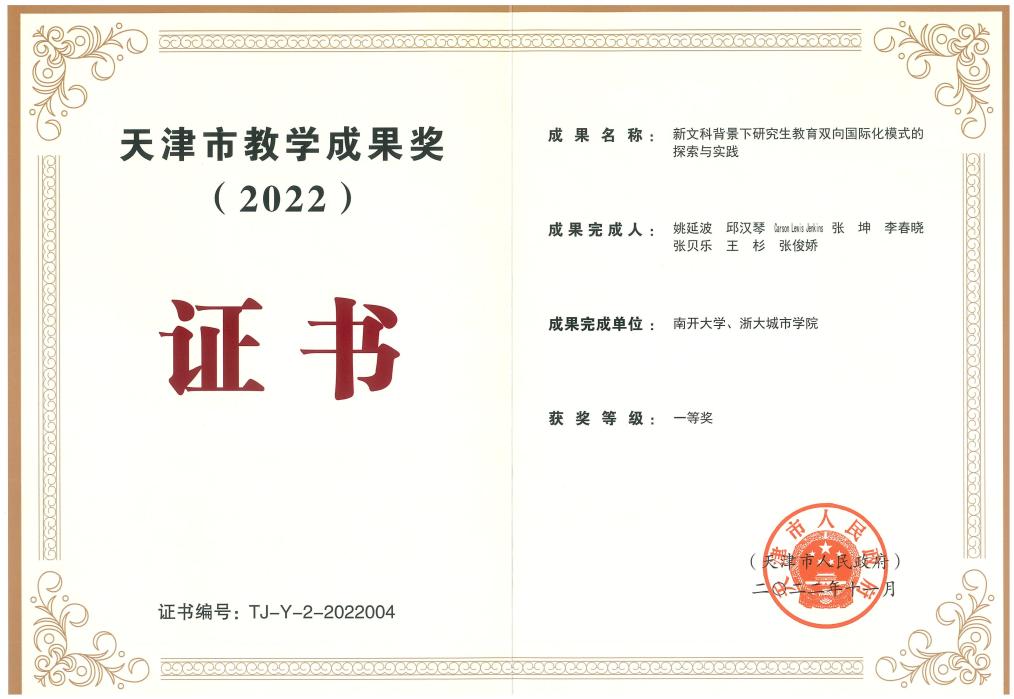 近日,由浙大城市学院国际文化旅游学院院长、特聘教授邱汉琴作为主要成员申报的《新文科背景下研究生教育双向国际化模式的探索与实践》获得天津市教学成果一等奖。天津市教学成果奖是天津市教育教学领域的最高荣誉,每四年评选一次,代表了天津市教学成果的最高水平。