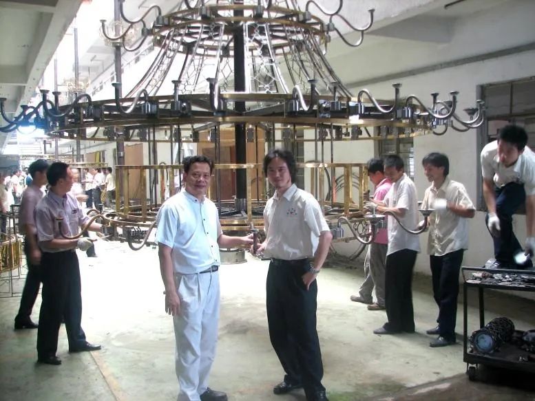 在常平镇下墟社区一栋古典建筑的外墙上,一块“人民大会堂灯具生产基地”的金属牌匾在阳光照耀下格外惹眼。基地主人即梵尔赛灯饰公司董事长黄河山此时正忙碌不已,作为人民大会堂灯饰主要供应商,他正在协调相关产品的各方面事务。