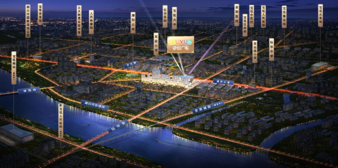 吾悦广场位于宝坻区潮阳大道和钰华街交口西南处,将建设一个建筑面积约8.5万平方米的购物中心和一条1.5万平方米的特色商业街,购物中心分为8层(地上6层、地下2层),项目计划地下二层为大型停车场,地下一层为超级大卖场,首层以时尚餐饮、珠宝、国际化妆品牌为主,二层为百货零售、品牌服饰、潮牌店,三、四层为童趣乐园、文艺书吧、技能培训等成长体验中心,五、六层为美食博览、巨幕影城、天幕泳池等。项目已于2021年底开工,计划于2024年年底开业。